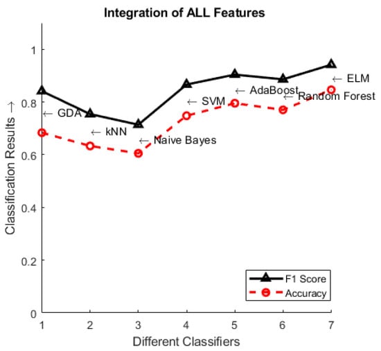 Classification results using the integration of all features (i.e., FI 3) among the classifiers.