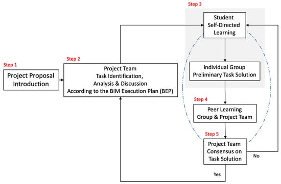 The implementation of BIM is developed within a collaborative methodology of active learning. The methodology begins with the presentation of the proposed project to the students, along with the collaborative methodology between teachers (FPD tutors) and students that will be used for the development of the project and the preparation of the BIM Execution Plan (BEP) (step 1). BEP specifies in detail the assignment of BIM uses, roles and responsibilities, deliverables, types of models, software versions, temporal planning through phases and milestones, planned collaborative work, etc. All the documentation generated in the BEP during this phase was allowed to be accessed by the entire team (students and tutors) in multi-platform cloud file hosting services.