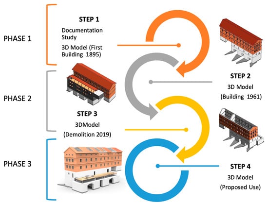 The main tasks of the project are included in three phases: Recording the building’s information (phase 1), modeling the existing building (phase 2), and designing the intervention as a proposal for the new use of the building (phase 3). These phases were developed in four steps (Figure 2).