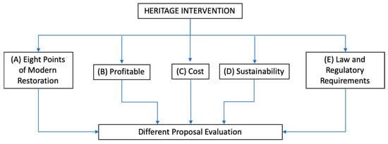 Figure 4 shows the 5 criteria that the project team considered in the evaluation of proposals and the selection of solutions to the different tasks proposed in the project. Any proposal that does not meet criteria A (Fulfillment of the Eight Points of Modern Restoration) and E (Fulfillment of Law and Regulatory Requirements, Norms and Legislation) is rejected. The criteria of cost, profitability, and sustainability are evaluated using a Likert scale from 1 to 5, with higher scores given to solutions that perform better. Lower-cost alternatives are given a higher value. In the pooling with the entire project team, the alternative that meets criteria A and E and obtains the highest score by adding the scores of the other criteria is chosen.