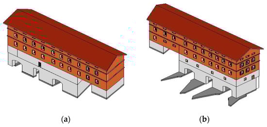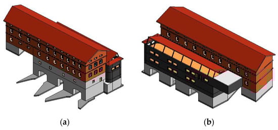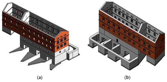 BIM model of the body of the factory: first phase, original condition. (a): Front view; (b) Rear view.
