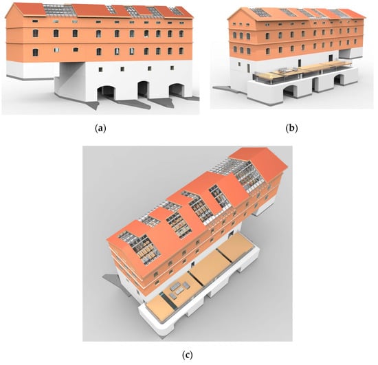External renderings (BIM) of the proposed preservation. (a): Rear view (b) Front view; (c) Plant.