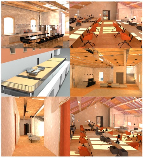 Finally, the new use was defined as a residential collaborative space whose objective is the promotion of research and collaborative work among professionals of all sciences, to promote the implementation of recovery projects and revaluation of industrial heritage buildings and goods. The residence plans included accommodations for researchers in connection with the General Archive of Simancas for consultation outside of its official facilities. Therefore, the objective was to establish a center for the creation of conservation and innovation initiatives in the field of industrial heritage protection. With this new use, the already known and integrated coworking concept can evolve into another context: Research.
