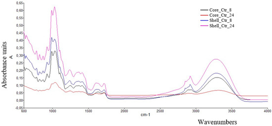 As-collected FT-IR spectra of the control samples of the wounded pineapple shell and core. Ctr_8: control stored at 5 ± 1 °C for 8 h; Ctr_24: control stored at 5 ± 1 °C for 24 h.