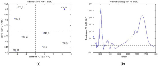 Principal component analysis score plot for pineapple shell FT-IR spectra of the control (Ctr) and heat-treated (T) wounded pineapple shell samples, stored at 5 ± 1 °C for 8 h (_8) and 24 h (_24). (a) PC1 versus scores on PC2; (b) loadings plot on PC1. T30_8: heat-treated at 30 °C for 15 min and stored at 5 ± 1 °C for 8 h; T30_24: heat-treated at 30 °C for 15 min and stored at 5 ± 1 °C for 24 h; T40_8: heat-treated at 40 °C for 15 min and stored at 5 ± 1 °C for 8 h; T40_24: heat-treated at 40 °C for 15 min and stored at 5 ± 1 °C for 24 h; T50_8: heat-treated at 50 °C for 15 min and stored at 5 ± 1 °C for 8 h; T50_24: heat-treated at 50 °C for 15 min and stored at 5 ± 1 °C for 24 h.