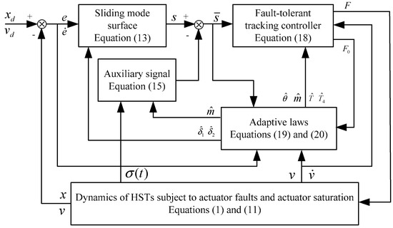 Motivated by the above analysis and inspired especially by the work of Lin et al. [22], an adaptive passive fault-tolerant tracking control strategy based on a variable-gain PID-type sliding mode surface is presented for HSTs in which parametric uncertainties, additional disturbance, unknown actuator faults, and actuator output saturation are taken into account simultaneously. The adopted variable-gain PID-type sliding mode surface is featured with variable gains and can offer fast transient response, low steady-state error, and strong robustness [23]. An adaptive adjustment technique is employed to estimate the nominal model parameters, upper bounds of the lumped uncertainty, and gains of the PID-type sliding mode surface, respectively. An auxiliary signal is introduced to deal with actuator saturation. The proposed strategy is fully model-independent and does not require the information of actuator faults. As a result, simple structure and inexpensive computation are achieved, which is exactly what is expected in practical application. Based on Lyapunov theory and simulation results, it is analyzed and demonstrated that the proposed controller can track the desired position and velocity trajectories accurately, and has strong robustness to the lumped uncertainty and the actuator faults.