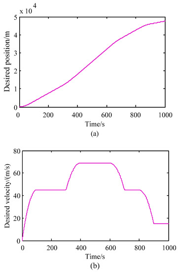 To verify the effectiveness of the designed controller, we simulated a running process with several operation conditions, which contains two acceleration phases, four cruising phases, and two deceleration phases, as depicted in Figure 4. Parameters of the designed controller were selected as: , , , , , , , , , . Initial values involved in the controller were chosen as follows: , , , , , , . The upper and lower bounds of are and , respectively. To mitigate the chattering and make the control force smooth, when , in the controller is replaced by , where is a small positive constant with the value of in the simulation. Based on the above simulation parameters, several different simulations were performed as follows to demonstrate the performance of the proposed controller.