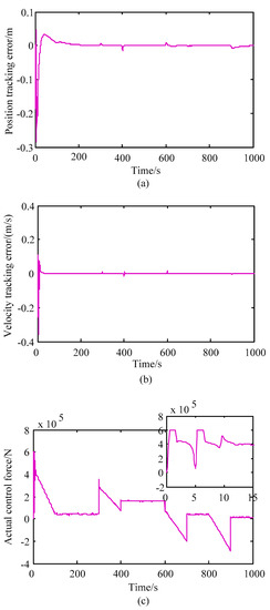 In addition, to further verify the necessity of considering anti-actuator saturation in the design of a controller, simulation was carried out for the case without anti-actuator saturation. Without considering the anti-actuator saturation, and in the case of 30% loss of actuator effectiveness, i.e., , the control performance for HSTs with the actuator output limits and is shown in Figure 7. It can be seen that the tracking errors of the system increases substantially, and the system becomes unstable. Moreover, the chattering problem of the actuator’s actual output becomes very serious, which is not allowed in practical train operation. Figure 7 demonstrates the importance and necessity of considering anti-actuator saturation in train fault-tolerant tracking controllers.