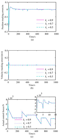 Along with the decrease of value, loss of actuator effectiveness faults becomes more and more serious and the impact of actuator faults on train tracking operation is growing. However, as can be seen from Figure 6, the position tracking error and the velocity tracking error do not increase significantly along with the severity of actuator faults and remain small all the time. It can also be seen that there is still no obvious chattering and the anti-actuator saturation is effective. Figure 6 illustrates that the proposed controller can accommodate loss of actuator effectiveness faults, handle actuator output saturation constraint, and has good fault-tolerant tracking capacity.