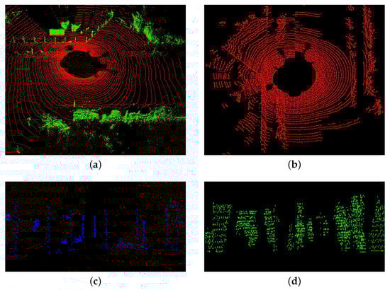 (a) is the result of ground segmentation. In (a), the red points are labeled as ground points and the green points are labeled as non-ground points. (b–d) are the ground planar features, non-ground edge features and non-ground planar features.
