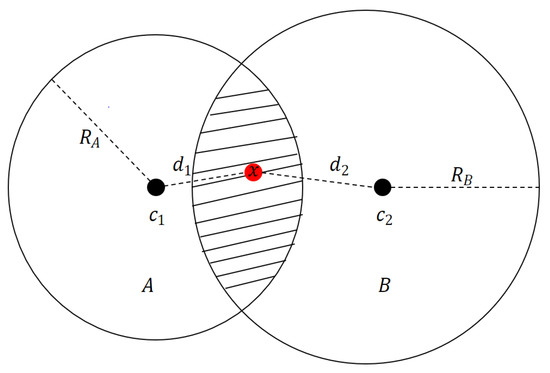 Illustration of POU implicit surface. Two cells, A and B, are associated with their support radius and , respectively. The value of a point x in the slashed region can be evaluated by ; ; , where and are the distances from the point x to the and , respectively, and are the support radius, and are local plane functions.