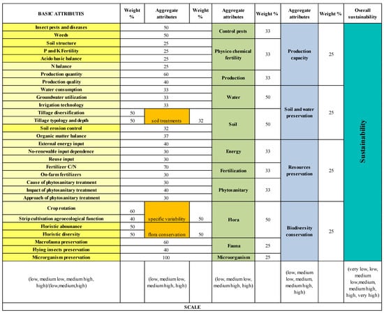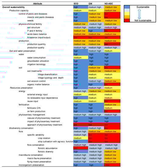 The “resources preservation” aggregate attribute differed for the attributes related to the “energy” and “fertilization”, which scored frequently “high” and “medium” in ECO treatment, “medium” in GM and “medium-low” and “low” in NO ASC. No differences were found in the first order “phytosanitary management” attribute and in the basic attributes.