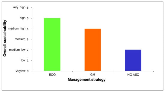 Finally, the DEXi-met output showed substantial differences in the aggregate nodal attribute “biodiversity conservation” among the systems, as explained above. In particular, the introduction of the ASC increased the score both in ECO and GM (“high” and “medium-high”, respectively), compared to the NO ASC management strategy. Similarly, other studies indicated that the presence of ASC enhances the insect and arthropods communities [], as well as the soil microbial activities [].