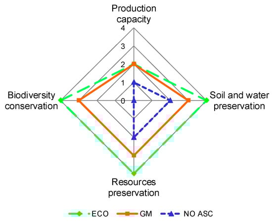 The nodal aggregate attribute “production capacity” resulted in “medium” in ECO and GM treatments and “medium-low” in NO ASC (Figure 3).