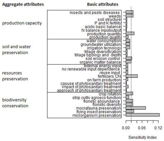 The “microorganism preservation” and the “macrofauna preservation” reached the highest (0.12 and 0.08, respectively) SI values, being the most influential variables of the first order “biodiversity conservation” attribute. Within the “resources preservation” aggregate attribute, the “fertilizer C/N” basic attribute reached the highest SI value, while in the “production capacity” attribute, the “insects and pest diseases” and the “weeds” and “production quantity” showed higher values compared with the other basic attributes. Within the “soil and water preservation” component, the only basic attribute “soil erosion control” overtakes the 0.2 sensitivity index.