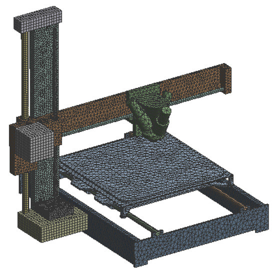 Finite element modeling directly affects the calculation results, so it is indispensable to consider such factors as model simplification, grid number, element type, the quality of the mesh, and so on. The model of the color 3D printer is simplified by considering the key factors that affect the accuracy of the simulation. In the color 3D printer model, the technical holes with a diameter of less than 10 mm are ignored, and the transition fillets are equivalent to a right angle, and the bolt holes lying in the non-key position with a diameter of less than 10 mm are ignored. The finite element model of the color 3D printer is established, as shown in Figure 6.