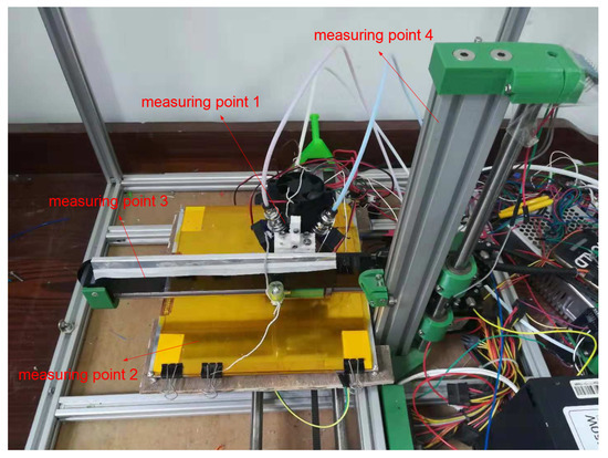 According to the results of modal analysis, four measuring points are arranged on the FDM color 3D printer, as shown in Figure 7. Measuring point 1 is placed at the position of the nozzle, measuring point 2 is placed at the position of hotbed, measuring point 3 is placed at the position of the cross beam, and measuring point 4 is placed at the position of the main beam. The vibration signals of the color 3D printer in the horizontal (X), longitudinal (Y), and vertical (Z) directions are, respectively, measured by four measuring points, thereby further analyzing the vibration signals of the 3D printer.