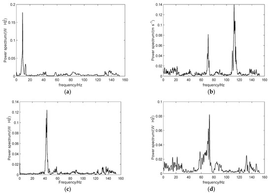 Frequency spectrum of four measuring points before optimization. (a) measuring point 1, (b) measuring point 2, (c) measuring point 3, and (d) measuring point 4.