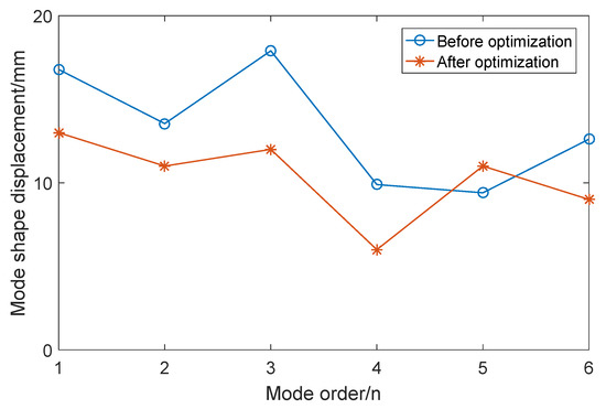 The optimized mechanical structure has a lower displacement of the mode shape except for the fifth-order mode, and the modal displacement of other orders is significantly decreased. Therefore, the overall vibration is effectively reduced and the optimization scheme obtained by the analysis process has a significant effect on the optimization of the vibration characteristics.