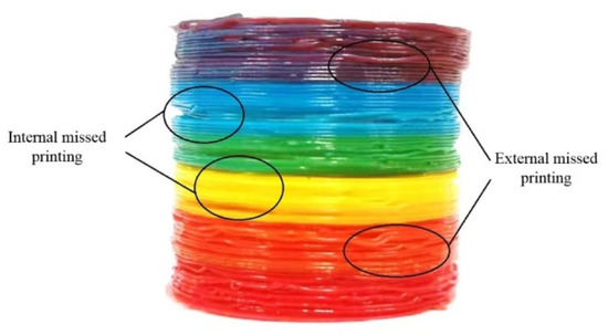 In the process of printing, the extrusion filament material is sufficient from beginning to end. The different vibration types will produce different missed printing effects. Missed printing can be divided into two categories: internal missed printing and external missed printing, as can be shown in Figure 15. When the random vibration is outward, the extrusion filament material will adhere to the surface of the cylinder because of the radian of the cylinder, then the effect of external missed printing will be forming. When the random vibration is inward, the extrusion filament material will disappear because the printing arc is overlapped the internal part, then the obvious hollowing will be forming an internal missed printing.