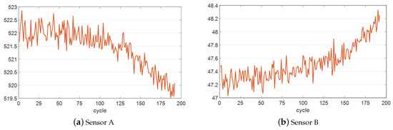 The performance degradation of equipment may result in changes in sensor measurements, which are rewarding for the application of prognostics techniques. As shown in Figure 1, sensor variation tends either to rise or fall over time in a sequence. In practice, during the entire operation cycle of equipment, there are two phases: the first phase is normal performance, illustrating a relatively flat trend; the second phase is degradation performance, illustrating an approximately exponential dropping trend.