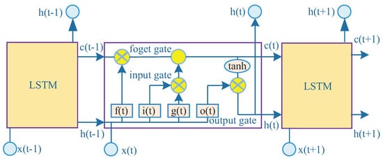 LSTM is a special architecture of RNN. As is shown in Figure 5, the series recurrent unit is the LSTM cell rather than a simple RNN cell. An LSTM cell possesses long-term memory, which is attributable to three gates modulating the flow of information in the LSTM cell: the input gate, forget gate, and output gate.