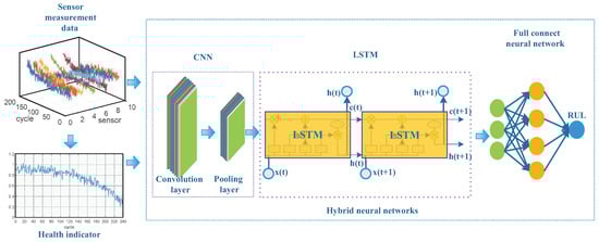 Nevertheless, higher prediction demands make it unfeasible for those traditional data-driven methods to handle a growing number of complicated data [31]. In pursuit of better performance for RUL prognostics, a family of deep learning models has emerged with the ability of automatic feature extraction and high prognostics accuracy [32]. In the field of RUL estimation, a convolutional neural network (CNN) is utilized to obtain high-level spatial features from the raw sensor signals in [33,34]. In addition, long short-term memory (LSTM) neural networks are applied to be specialized in extracting sensor temporal information [1,8,35,36]. However, only spatial or temporal characteristics are considered in the above single deep learning model. Preferably, an emerging scheme combining CNN and LSTM (CNN-LSTM) has been suggested in recent research [37,38,39,40,41], most of which focuses on natural language processing, speech processing, video processing, and so forth. The applications of CNN-LSTM ensembles on prediction are countable [42]. Representative literature introducing this scheme to predict residential energy consumption can be found in [43], where raw sensor data are directly in use for prediction. For RUL prognostics, more features should be taken into account to describe equipment degradation. It is proven that the addition of a health indicator (HI) can produce accurate prediction results [13].