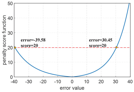 For the sake of evaluating the performance of the proposed scheme, some evaluation metrics of prediction performance are adopted. These are root mean square error (RMSE), mean absolute percentage error (MAPE), mean absolute error (MAE), and penalty score function. The first four metrics adopted are popularly applied in prognostics tasks. Dissimilarly, the penalty score function is given by PHM2008 competition [44] specifically for RUL prognostics evaluation. The penalty score function is asymmetric, as early prediction is preferred over late prediction. It can be seen from Figure 7 that the tolerance of advanced prognostics is greater than delayed prognostics for the same penalty score value. Evaluation metrics are formulated as follows: