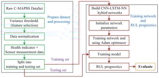 The flowchart of the proposed scheme of RUL prognostics is presented in Figure 8. Firstly, the raw C-MAPSS dataset is processed to select proper input data using the variance threshold, and the corresponding data are normalized by the z-score normalization method. Next, the preselected data are transformed into a one-dimensional health indicator. The processed datasets are split into the training set and the testing set.