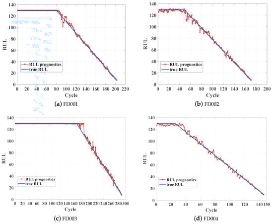 In order to empirically evaluate the availability of the proposed scheme for RUL prognostics, the proposed scheme was tested with the testing set. As shown in Figure 9, four testing trajectories selected from four sub-datasets are taken as examples. Though some obvious errors exist between the prediction values and the true RUL values, the prognostic performance is good, especially when the equipment is close to failure. Preferably, accurate RUL prognostics of the equipment in the late phase would be able to improve management availability and reduce maintenance costs because it is extremely necessary to maintain or exchange equipment in the last phase of its lifetime.