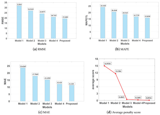 All of these methods were simulated and applied to the C-MAPSS dataset. Table 2 and Table 3 show the results of the performance comparison using four sub-datasets. Figure 10 shows the model comparison in terms of the RMSE, MAP, MAE, and the average penalty score for the entire testing set. The average penalty score is defined as follows:
