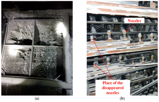 In the coal-fired power plant, the SCR facility is usually installed between the boiler and the air preheater [13,14,15,16] and works with the dust-laden gas. The accumulation and the deposition of the ash particles, especially the large-sized particles, will increase the risk of catalyst deactivation [17,18]. Although soot blowers are used before the catalyst layers [13,19,20], the blockage and erosion of the monolith catalysts often occur. Figure 1a shows the breakage of the catalyst layer for a 660 MW coal-fired power plant. Moreover, the high-speed flue gas containing ash particles would lead to severe erosion on the ammonia injection grid (AIG) and the support structure, as shown in Figure 1b. It would shorten the lifetime of the catalysts and threaten the performance of the SCR-deNOx facility. Hence, it is necessary to investigate the distribution of ash particles and take steps to disperse particle accumulation inside the SCR-deNOx facility.
