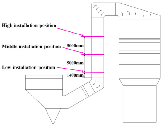 Attempts are also made to investigate the optimal installing position for the triangular deflector in the vertical duct. The deflector is installed at three different heights, as shown in Figure 4. The corresponding simulations are carried out with a low deflector installation, a middle deflector installation and a high deflector installation, respectively. Comparisons are made among the simulation results of these cases and data processing is conducted via MATLAB to evaluate the dispersal effect.