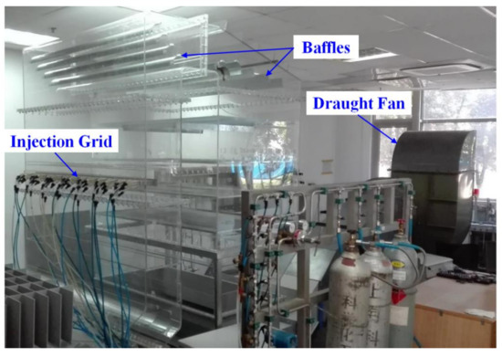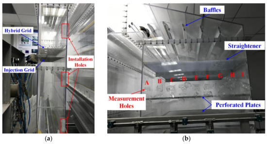 The SCR-deNOx facility with a scale of 1:12 is made from plexiglas while the baffles geometry is made of aluminum slices. Perforated plates are substituted for the catalyst layers to provide the pressure drop. Several small holes are processed in advance on the plexiglas as follows: six of them are used to set the triangular deflectors, as shown in Figure 6a. Meanwhile, the other nine of them are located above the perforated plates and are used for the measurement, which is shown in Figure 6b. As can be seen, they are sealed with plastic tapes if no measurement is conducted.