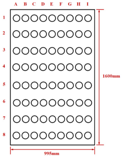 Meanwhile, a semicircular steel tube is used to collect the crushed millet. The tube is inserted into the nine small holes one by one, representing the distribution of the ash particles. The weights of millet for the nine collections are measured by a METTLER-TOLEDO analytical balance. Figure 7 illustrates the 72 detection spots over the perforated plate. They are arranged in an 8 × 9 matrix and the characters A–I refer to the nine small holes used for the measurement.