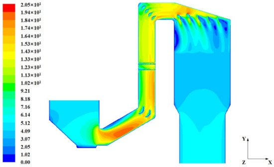 Furthermore, combined with the central sectional contour shown in Figure 9, it is indicated that the low deflector installation is located in the high-speed area of the flow field in the vertical duct. Therefore, installing the triangular deflectors in the high-speed area of the vertical duct may be an efficient way to disperse particles with relatively large sizes and reduce particle accumulation at the entrance of the catalysts.