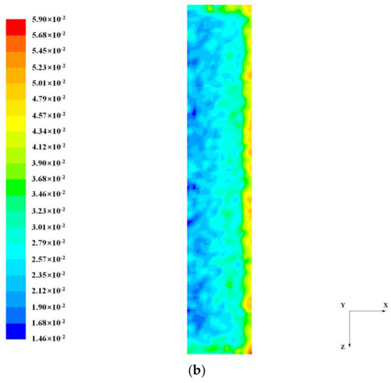 As shown in Figure 11, there are 10 columns in both the X-direction and the Z-direction. It is indicated that the ash particle distribution is generally homogeneous in the Z-direction. Although the numbers of ash particles near the wall are relatively small, most of the percentages are close to the average level of 10%. However, an obviously inhomogeneous distribution of ash particle is observed along the X-direction. The deviation between the maximum and the minimum is about 20 percentage points. It is revealed that the ash particles are accumulated near the central area of the plane, especially in the fifth column. On the contrary, the amount of ash particles is quite small in the first and second columns, indicating that few ash particles are accumulated near the left-side wall, which is corresponding to the inner side of the wedge-shaped turning. Similarly, for the ash particles at plane 2, the distribution is relatively homogeneous along the Z-direction while it is quite inhomogeneous along the X-direction. According to Figure 12a, a severe accumulation of ash particles occurs near the right-side wall along the X-direction, which may lead to a drastic impact on the AIG and the support structure.
