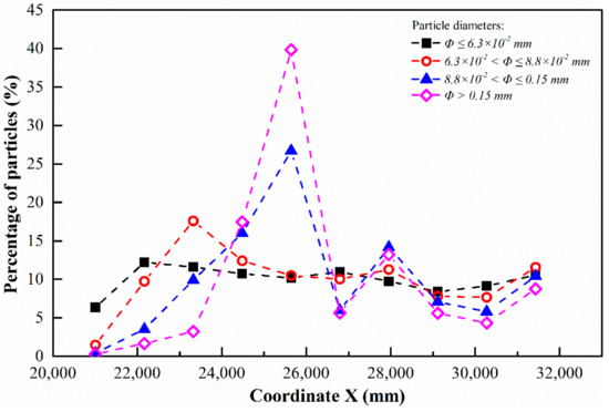 Generally, it is indicated that the installation of the triangular deflector cannot substantially improve the distributions of small-sized and medium-sized particles, while it plays a positive role in reducing the accumulation of the large-sized and extra-large-sized particles. Although the performance varies from each other among Figure 18b–d, the accumulated large-sized and extra-large-sized particles are dispersed and the corresponding maximum percentage decreases. The installation of the triangular deflector may not only disperse particles itself but also reduce the momentum of the particles. When passing the turnings in the downstream side, the particles larger than 8.8 × 10−2 mm possess fewer inertia and are unable to accumulate easily in the area near the central line of plane 1.