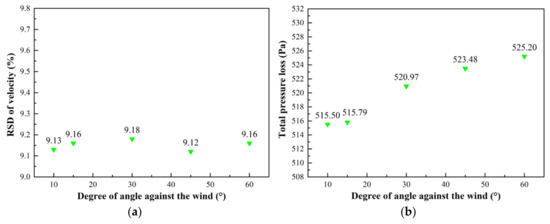 Statistical indices for deflectors with different angles against the wind: (a) the relative standard deviation (RSDs) of velocity, (b) the total pressure loss.