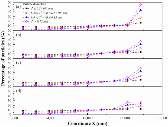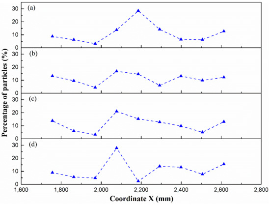 As shown in Table 2 and Table 3, the low deflector installation gives the best performance on reducing the accumulation of large-sized and extra-large-sized particles. Compared with Figure 18a, which shows the particle distribution without the deflector, the maximum percentages of the accumulated large-sized and extra-large-sized particles decrease from 26.73% to 21.70% and from 39.84% to 20.59%, respectively, which is better than the middle and high deflector installations. Besides, the RSDs of the large-sized and extra-large-sized particles with the low deflector installation are 61.73% and 66.12%, which is the smallest among the four cases.