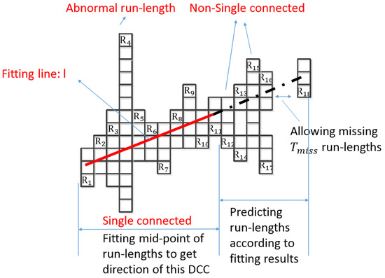 The first step is to determine the direction of DCC. DCC is made up of adjacent run lengths, but adjacent run lengths can be either singly connected or non-singly connected. For a run length, if there is only one adjacent run length on each side, such as , or one side has no run length and one side has only one connected run length, such as , it is singly connected. Otherwise, it is non-singly connected, such as . The DCC will create branches and goes to several directions if there is a non-singly connected run length. In addition, the first run lengths will determine the direction of a DCC. Therefore, when searching a DCC, the adjacent single connected run lengths should be found first. However, if the number of searched adjacent singly connected run length is less than , these searched run lengths make up a DCC, and the DCC search ends, which need not go to the next process in the first step and second step. If adjacent singly connected run lengths are found, they become a part of a new DCC, and then we get a line l by the least-square method of fitting for mid-points of these adjacent singly connected run lengths [31]. The fitting line can be represented as Equation (1).