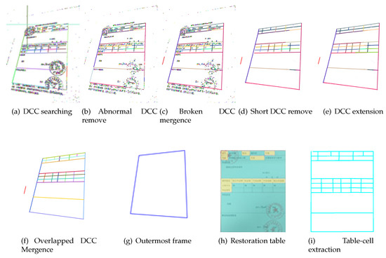 It is found that a stamp will be searched for as a series of short DCCs with various slopes to form a circle, by observing and analyzing lots of tables with stamps, as shown in Figure 5a. Therefore, the stamp can be filtered by abnormal DCC remove and short DCC removal, as mentioned above.