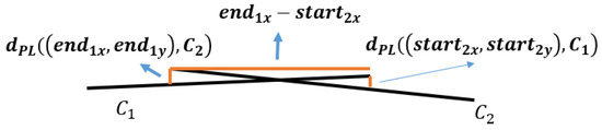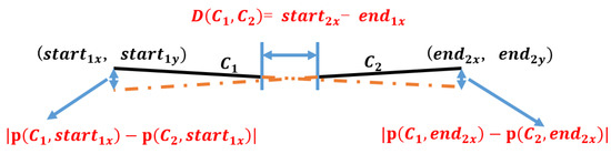 where represents the threshold of slope difference, represents the threshold of intercept difference, and represents threshold of interval distance between and . Given that and are respectively used to represent the length of and the length of , is computed by Equation (7):