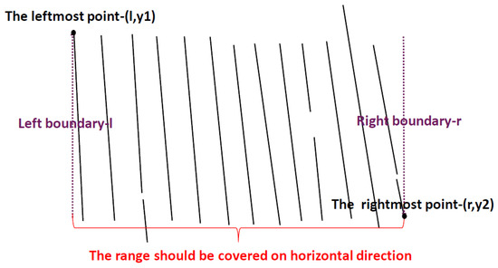 Overlapped DCCs will appear after broken DCC mergence and DCC extension, such as the DCCs in the middle region of Figure 8. They may belong to the same ruling-line, but have now become overlapped because of the mistake during slope computing, and thus they should be merged. Before that, overlapped distance and overlapped deviation are defined. Given that C represents a DCC, and represents the distance from the point (x,y) to C, overlapped distance will be the larger one between and . In addition, the overlapped deviation between and is:
