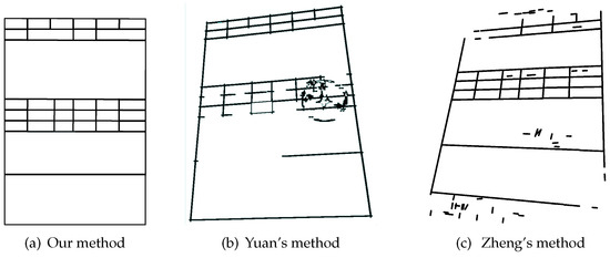 As shown in Table 2, the accuracy of our method is higher than Yuan’s [22] and Zheng’s [23], no matter in what kind of perspective transformation. Among them, our method works best in the case of rotation. This is because the ruling lines in the table keep the parallel relationships and vertical relationships after rotation, resulting in only a few DCCs belonging to the table being filtered in the abnormal DCC removal step that was introduced in Section 3.2.1. In addition, no matter what the rotation angle is, the accuracy of our method is over 92%, which implies our method can solve the traditional rotation problem effectively that generally occurs with a scanned document. For the perspective transformation of trapezoids and quadrilaterals, there is little difference in accuracy between the slight case and the obvious case, and all are over 92%. This is for the following two reasons. First, the DCC used in our method can search diagonal lines effectively, which allows the ruling lines of table occurring through perspective transformation to be found successfully. Secondly, the five techniques proposed in Section 3.2 (abnormal DCC remove, broken DCC mergence, short DCC remove, incomplete DCC extension, overlapped DCC mergence) allow the complete ruling lines to be detected, and interference such as irregular handwritten signatures and stamps to be filtered. Therefore, slight and obvious perspective transformation can be solved effectively with our method.