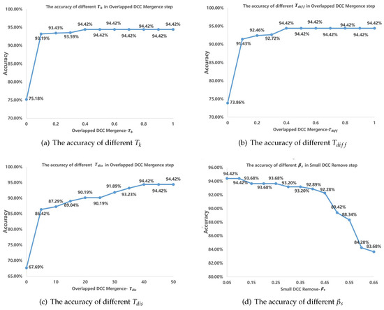 There are some thresholds to our method. To evaluate the effect of the method, the accuracies of different thresholds are tested. Table 6 shows the threshold in experiments. Experiments show that , , , will affect the table-recognition results with different values, while other thresholds have little effect on the recognition accuracy with different values. Figure 11 shows how those four thresholds effect table-recognition accuracy. As shown in Figure 11c, with increases, the table-recognition accuracy first increases rapidly, then increases slowly, and finally stays stable. Table 6 shows the optimal value of each threshold when the table-recognition accuracy is optimal.