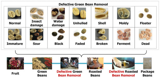 Advancement of recent information technologies evolves the agriculture and food industries. Enterprises are eager to create smart information systems to increase their business competition. Coffee is the largest amount of raw-food material in the world-wide agricultural trade [1]. For example, coffee beans worth over 25 billion USD per year are imported to the Taiwan market. Figure 1 illustrates the production process from green beans to coffee bean packages. The process illustrates from coffee fruit, green beans, defective bean removal, roast beans, to the final bean package. The classes of defective beans are categorized by the SCAA (Specialty Coffee Association of America). Among these stages, defective bean removal (or in short, defect removal) is one of most labor-consuming stages, and many companies investigate the automation of this stage for minimizing human efforts. In addition, the defective bean removal is a critical stage that affects the bean’s value, as many experts explicitly point out that defective beans are a key factor for providing high-quality coffee. Thus, removing defective beans becomes a necessary step before brewing for significantly increasing their competition and profits [2].
