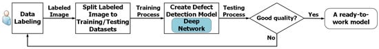 Supervised deep learning networks generate qualified models for achieve specified missions (e.g., classification, regression, etc.) with a labeled data set. A standard model generation flowchart for supervised learning applications is given in Figure 2. The first step is to generate the data set for training and testing. For example, we photograph some beans and label defect classes for them in each image. Note that the number of images is usually proportional to quality of generated deep learning models; however, preparing these images consumes huge amount of labor effort. The second step is to compose the training and testing data sets. Usually, of labeling images are randomly selected as the training data set, and the other as the testing data set. Then, in the third step, the training data set is used in generating a model by training the specified deep learning network with reducing the loss function to be acceptable small. Next, in the fourth step, the testing data set is used to validate that the generated model performs well in most cases, instead of incurring the overfitting phenomenon. If the generated model fails the validation, then the user may prepare more labeled data (i.e., bean images) and repeat the whole procedure until a qualified model is generated.
