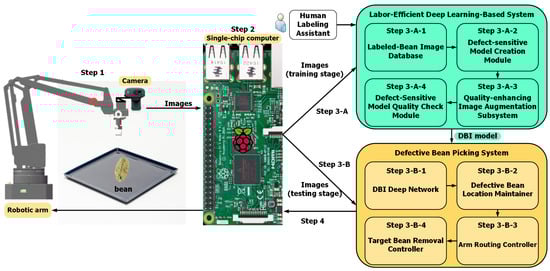 Figure 3 shows an illustration of applying defective bean inspection (DBI) model to remove defective beans with a robotic arm [20]. A defective bean picking system (DBPS) implemented in a single-chip computer inspects defective beans in the coffee tray with the DBI deep network and maintains locations of the defective beans in the defective bean location maintainer. Then, the DBPS guides the robotic arm to the top of each defective bean and removes them in sequence, which are performed by the arm routing controller and the target bean removal controller. In this system, a defective bean inspection model generation scheme is needed to obtain a DBI model for the DBI deep network, as shown in Figure 3, so that the defective bean picking system can successfully remove defective beans.