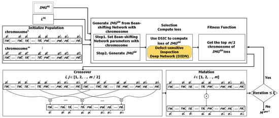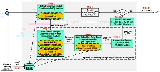 Inside the GALDAM, five key mechanisms, including design of Defect-Sensitive Inspection Deep Network (DIDN), design of Bean-Shifting Deep Network (BSDN), GAN-based framework for labeled data augmentation, GA-based optimizer for the proposed GAN framework, and low-detection-rate bean image generation, will be presented in the following subsections. These mechanisms work on two critical deep networks, DIDN and BSDN, and a GAN-structured optimizer, and they collaboratively generate a qualified DIDN model for defect inspection with merely limited human-labeled bean images, by complying the scheme workflow shown in Figure 4.